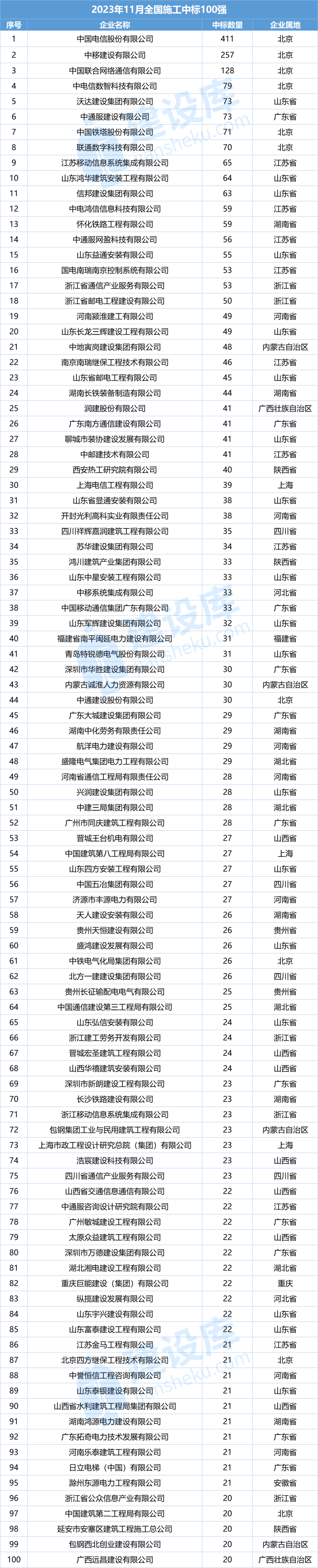以下是建设库大数据研究院统计的2023年11月全国施工中标100强名单,快来看看你们的企业排名~(更多详情,请联系400-023-5575)