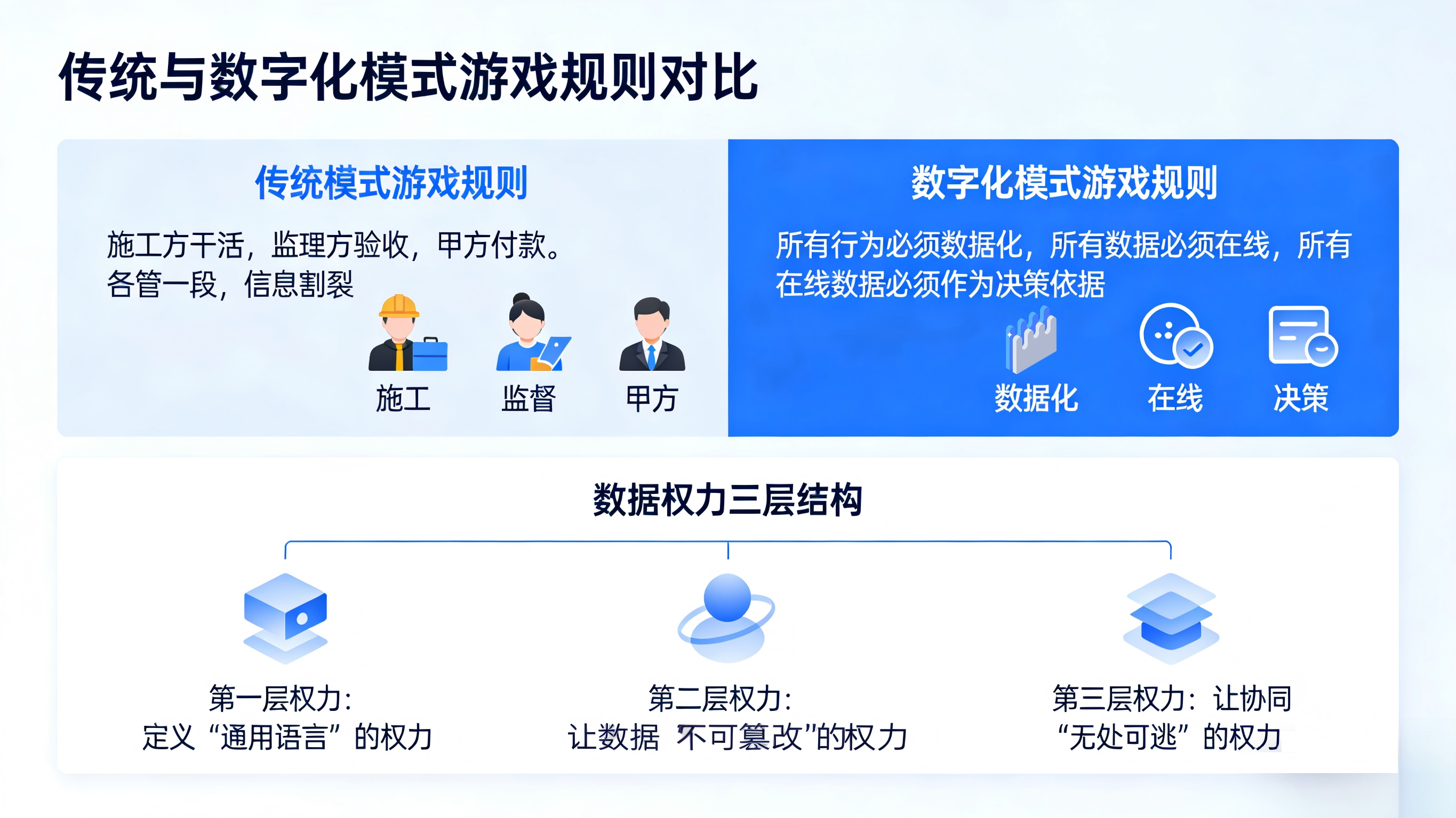 传统模式下,游戏规则是:施工方干活,监理方验收,甲方付款。各管一段,信息割裂。