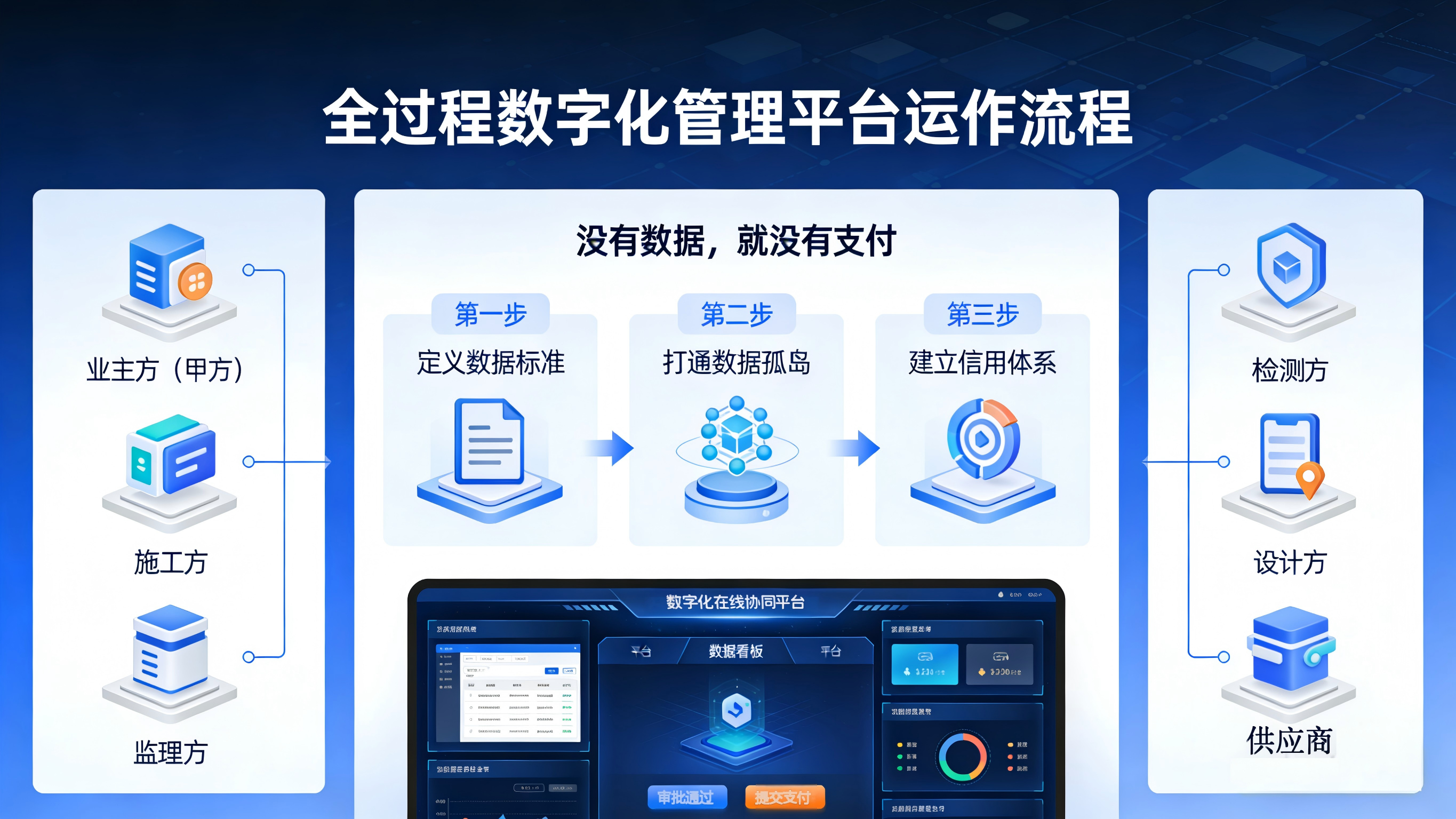 项目一开始,业主方(甲方)就上线了一套全过程数字化管理平台,把施工、监理、设计、检测等所有参建方都拉进来。平台的核心逻辑就是一句话:没有数据,就没有支付。